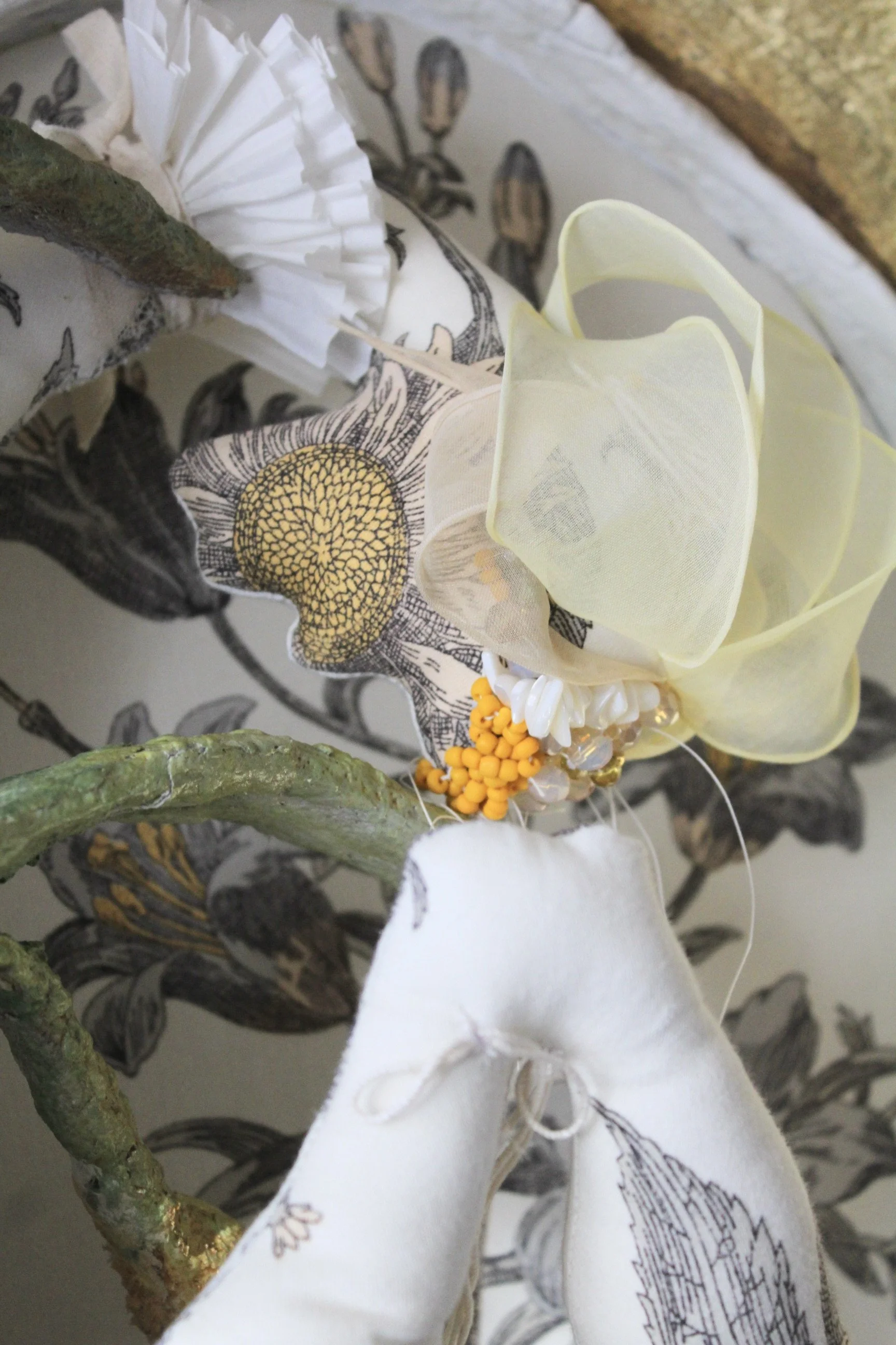 construct of my sculptures. The fusion of textile and paper forms a balance of linear and